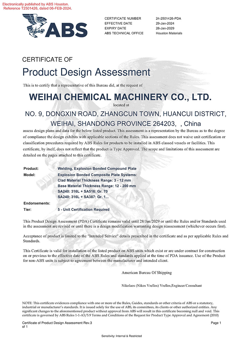 近日,威?;瘷C(jī)順利獲得美國(guó)船級(jí)社(ABS)頒發(fā)的產(chǎn)品設(shè)計(jì)PDA認(rèn)可證書(shū),認(rèn)可產(chǎn)品名稱(chēng)為“爆炸焊接復(fù)合板”,涵蓋產(chǎn)品種類(lèi):ASME SA264、ASME SA265、ASTM B898標(biāo)準(zhǔn)…